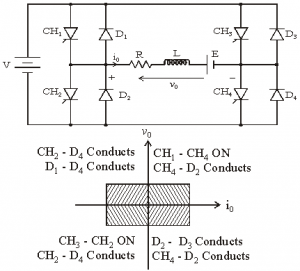 • When CH2 and CH3 are triggered, the load current iO flows in opposite direction & output voltage vO = -V.